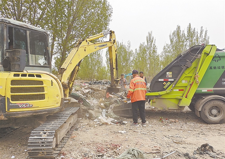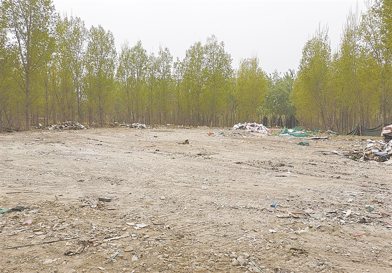 在這里,堆在地上的圍擋板、散落的各種生活垃圾、成片的建筑垃圾……布滿小路兩邊的林間空地。兩位拾荒者正在撿拾垃圾,他們告訴記者,“往里走,垃圾更多,他們過來撿點能賣錢的。”再往北走,能清楚地看到鏟車和挖掘機(jī)正在工作,它們將地上的垃圾挖起,堆放在一起。放眼看去,已經(jīng)有大大小小十多處的垃圾堆。在一處垃圾堆前,有工人正在等待著壓縮垃圾車前來運(yùn)輸。現(xiàn)場,還有30多名環(huán)衛(wèi)工人分散在不同地點,正在用鐵耙、鉤子等工具處理散落在樹林間的垃圾。“這幾天都是早晨7點半就來了,主要是清理機(jī)器不方便操作地方的一些垃圾。”一位環(huán)衛(wèi)工人說道。