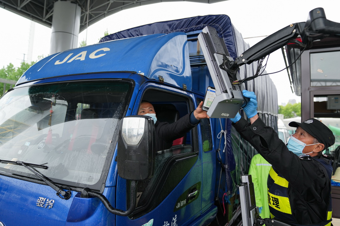 4月13日,在合肥百大周谷堆大興農(nóng)產(chǎn)品物流園,司機(jī)在智能化門禁系統(tǒng)上掃碼進(jìn)入。該園建立集測溫、核驗(yàn)安康碼、數(shù)據(jù)收集等功能的智能化門禁系統(tǒng),進(jìn)場駕乘人員不用下車即可快速核驗(yàn),實(shí)現(xiàn)防疫測溫智能化、人車追溯數(shù)據(jù)化。新華社記者 杜宇 攝