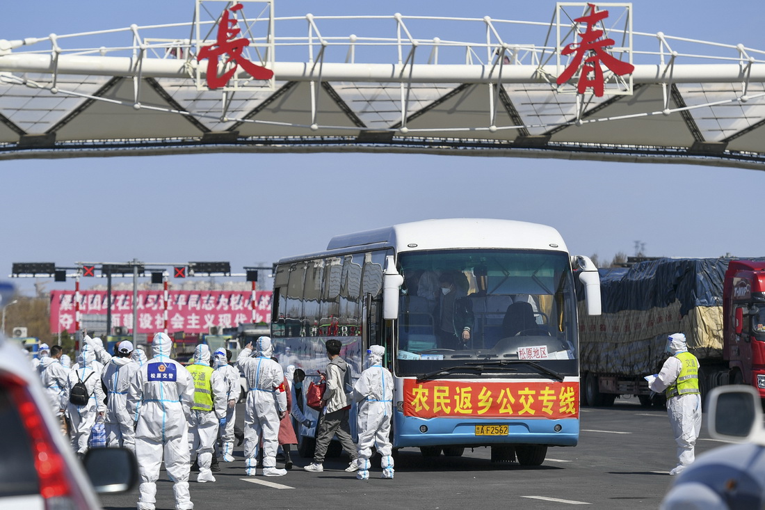 在吉林長春高速公路東出口,返鄉(xiāng)農(nóng)民登上返鄉(xiāng)公交專線(4月12日攝)。新華社發(fā)