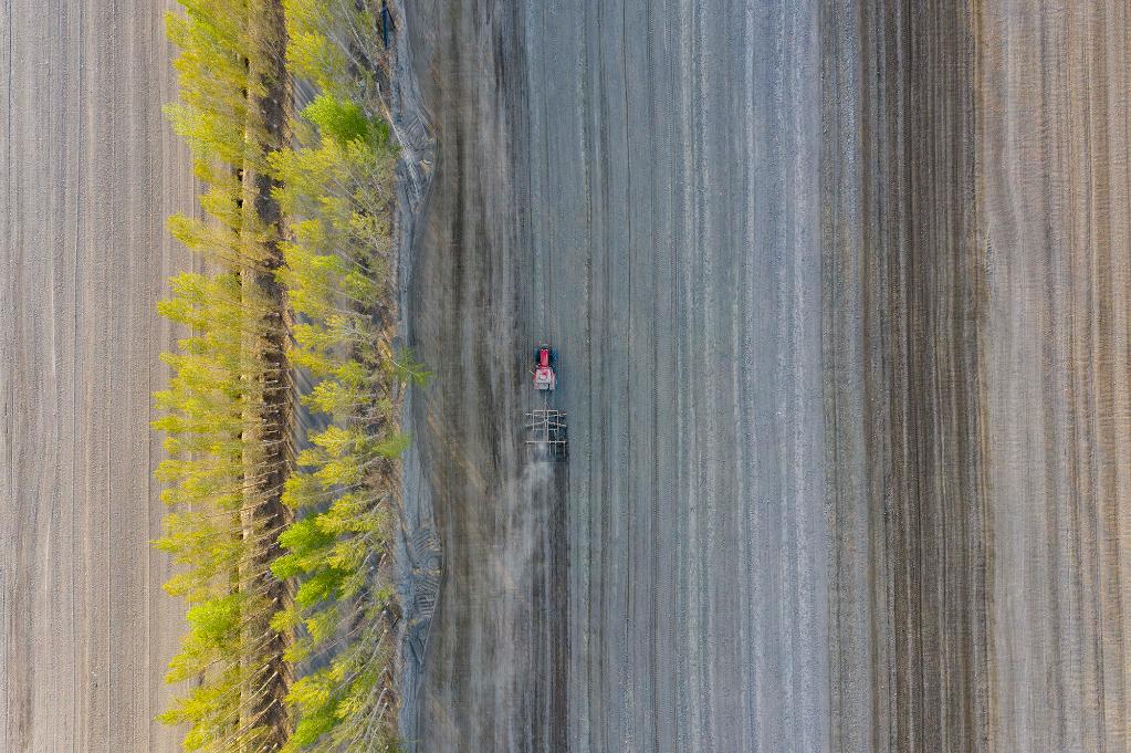 播種機(jī)在新疆沙灣市大泉鄉(xiāng)的一處棉田進(jìn)行播種作業(yè)。(無人機(jī)照片 新華社記者胡虎虎 攝)