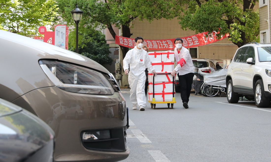 在上海市普陀區錦綠新城,社區志愿者為居民挨家挨戶運送生活物資(4月11日攝)。新華社記者 陳飛 攝