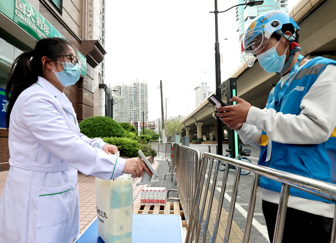 上海國大藥房南京西路店員工梁婷婷(左)在店前向快遞小哥交送顧客的訂單(4月10日攝)。新華社記者 陳建力 攝
