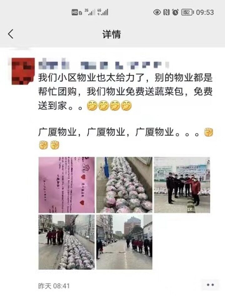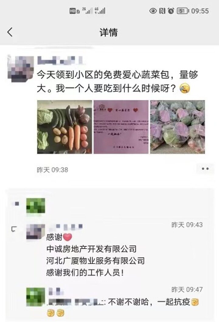 “從昨天凌晨到今早,一直在聯系蔬菜供應的各個細節,一點兒都沒覺得困,只要業主安心,我們就開心。”忙碌了一整夜,河北廣廈物業一名工作人員依然笑著感言。