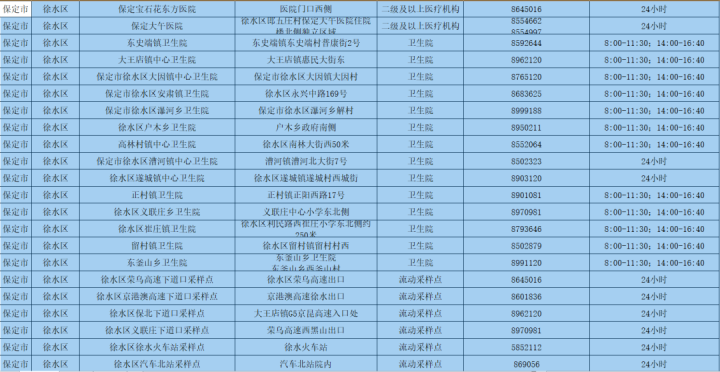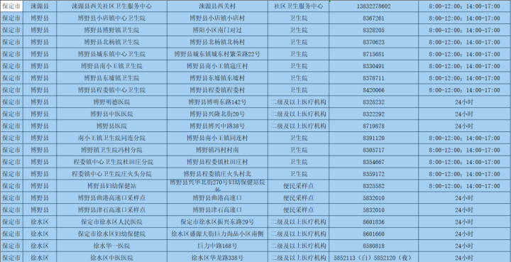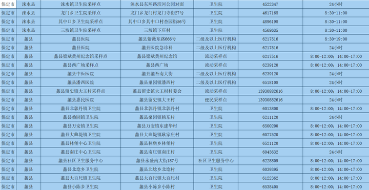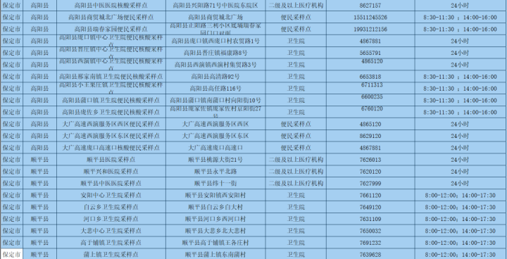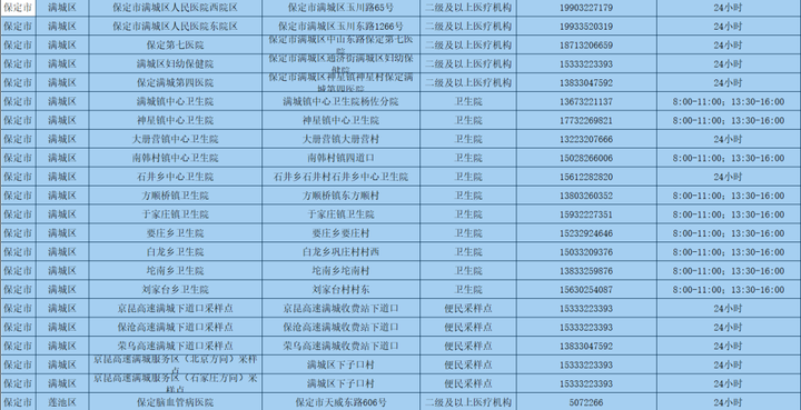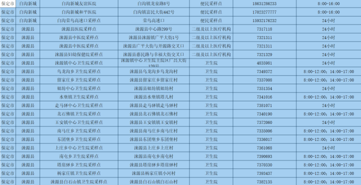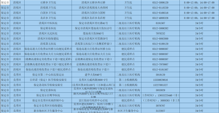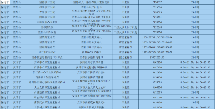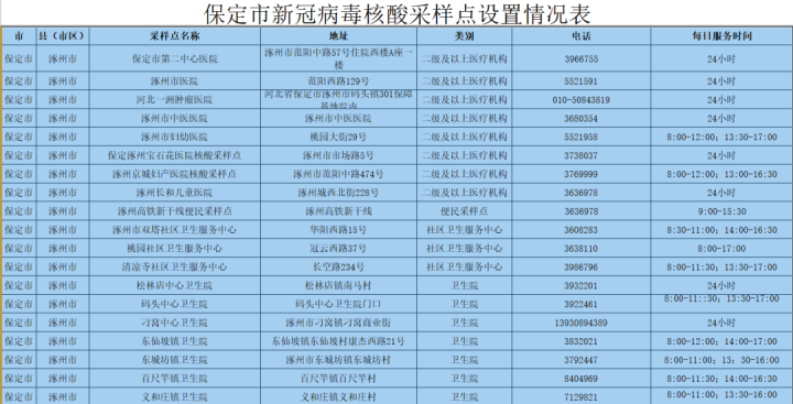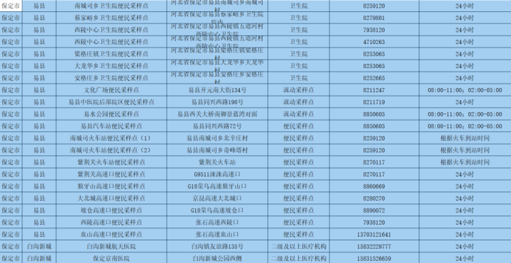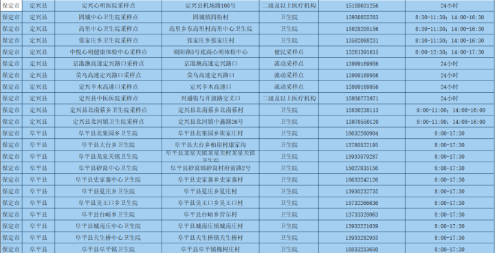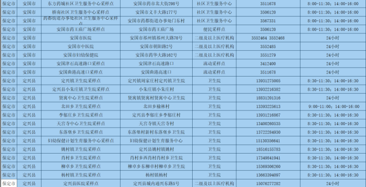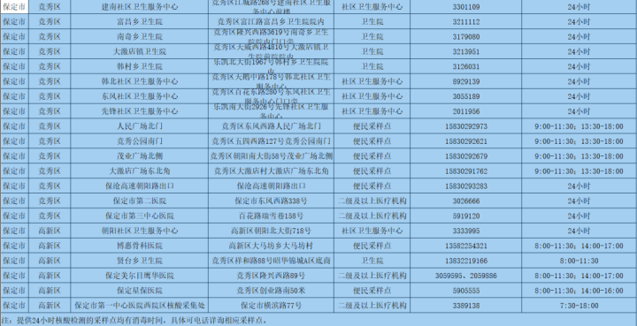 為更好方便群眾就地就近進(jìn)行核酸檢測(cè),保定市共設(shè)置新冠病毒核酸采樣點(diǎn)546個(gè)。其中二級(jí)及以上醫(yī)療機(jī)構(gòu)采樣點(diǎn)101個(gè),衛(wèi)生院采樣點(diǎn)245個(gè),社區(qū)衛(wèi)生服務(wù)中心(站)采樣點(diǎn)21個(gè);第三方檢測(cè)機(jī)構(gòu)采樣點(diǎn)2個(gè);便民采樣點(diǎn)102個(gè);流動(dòng)采樣點(diǎn)75個(gè)?,F(xiàn)予以公布: