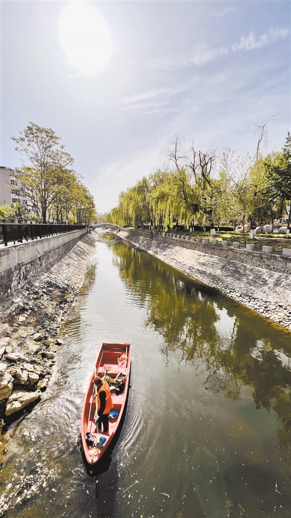 5月5日一早,記者來到北河沿,看到護河員正劃著小船清理著護城河內的雜物。
