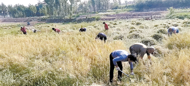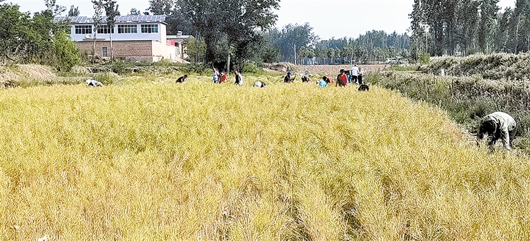往日金黃的油菜花已變成顆粒飽滿的油菜籽,在該村兩委干部們的帶動下,在家務工種地的村民、接送孩子上學的六七十歲的老人,總共二三十人紛紛找出了多年不用的鐮刀,自發加入義務勞動行列。大家精神飽滿,有說有笑,在熱火朝天的勞動中享受著收獲的快樂。