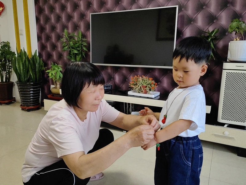 滿城區劉家臺鄉老人為孩子系五色繩葫蘆。陳璐 攝