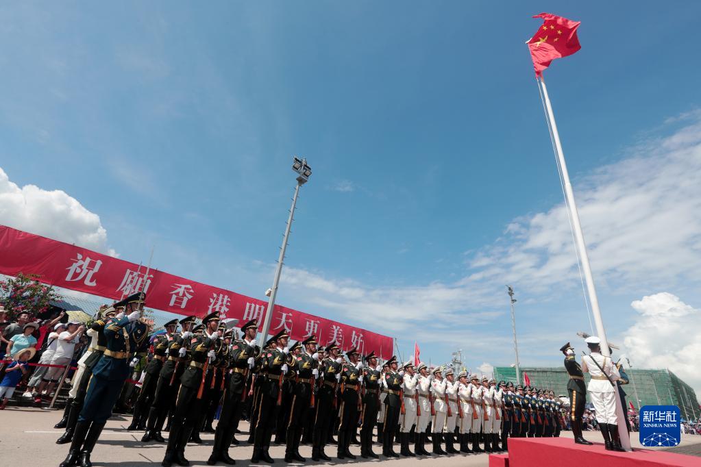 駐香港部隊某旅裝步一連官兵組織升國旗儀式(2019年6月30日攝)。新華社發(易定 攝)