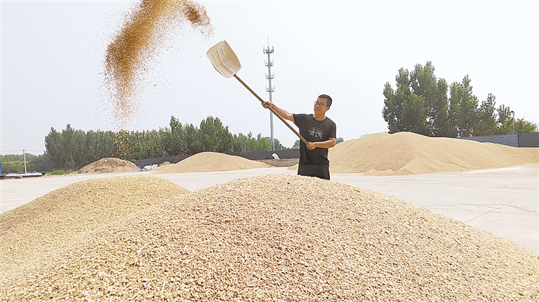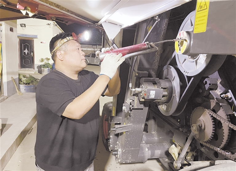 6月9日,烈日當(dāng)空,記者在村里見到他時(shí),他被曬得皮膚黑紅,見面第一句話就是,“現(xiàn)在正是忙的時(shí)候,鄉(xiāng)親們都排著隊(duì)等機(jī)器。”他一邊說,一邊擰開一瓶礦泉水,“咕咚咕咚”一口氣喝完。