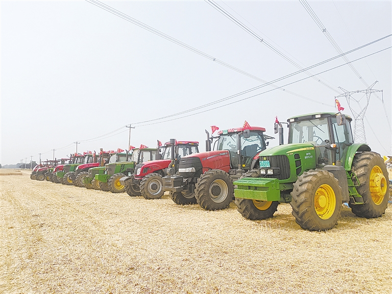 現(xiàn)代農(nóng)機(jī)合作社引領(lǐng)小農(nóng)戶邁向大農(nóng)業(yè)。圖為鑫農(nóng)農(nóng)機(jī)合作社里的一臺(tái)臺(tái)整齊待發(fā)的農(nóng)機(jī)。保定日?qǐng)?bào)通訊員 董偉 攝