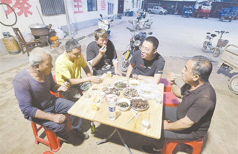 結(jié)束了一天的勞作,麥客們圍坐在一起吃飯,雖然很累但很快樂。崔路通 攝
