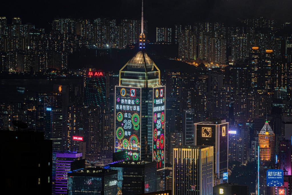 港島高樓上的喜慶裝飾(6月22日攝)。