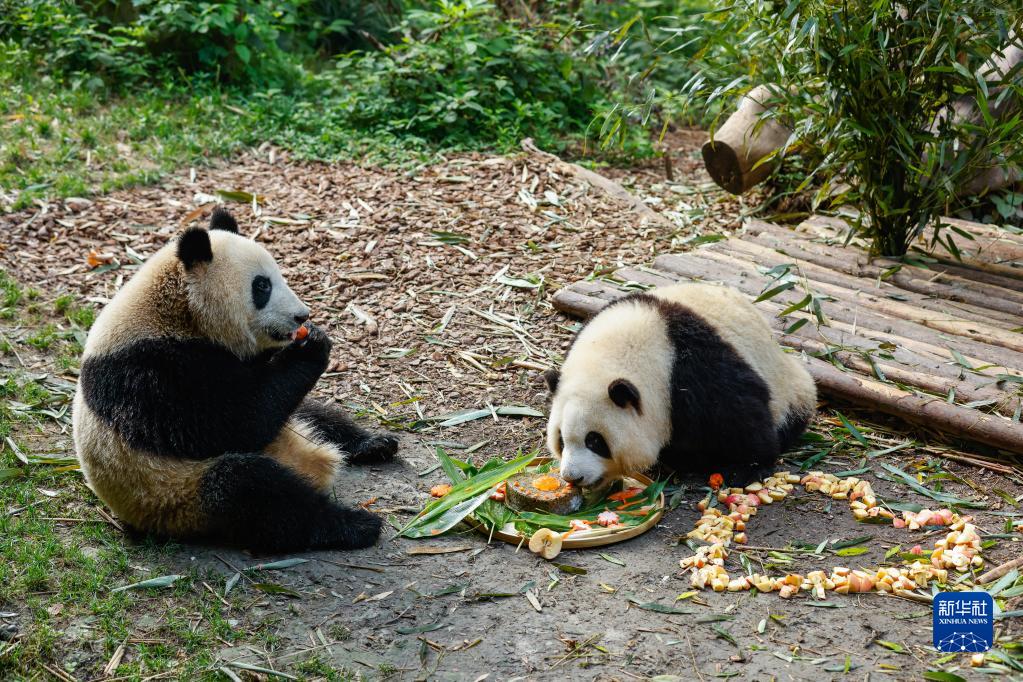 7月4日,在成都大熊貓繁育研究基地幼年大熊貓別墅,大熊貓“和花”(右)與“和葉”在享用特制的生日蛋糕及蘋果。