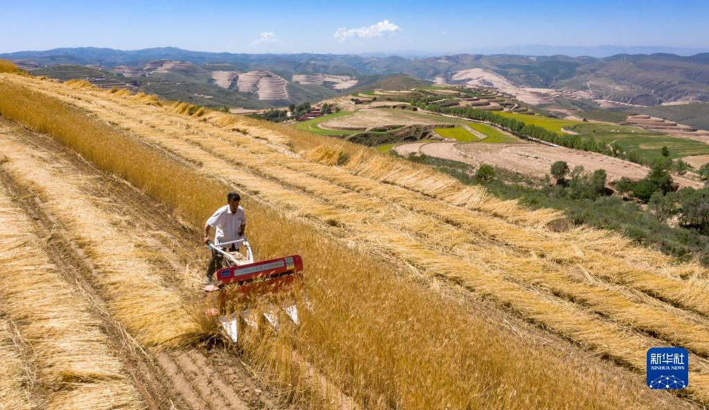 近日,寧夏西海固地區種植的冬小麥陸續進入收割季節。旱塬、梯田上一片金黃,農民操作著收割機械在其中忙碌。據了解,今年固原市夏糧面積42.89萬畝,其中冬小麥36.04萬畝。
