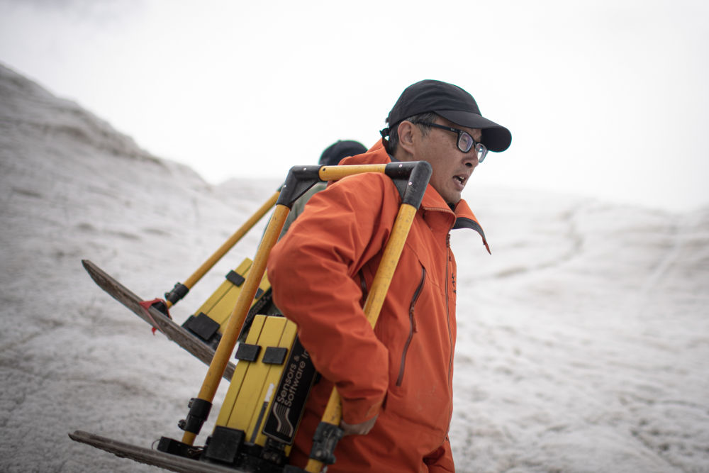 7月28日,在格拉丹東雪山,來自長江科學院的科考隊員定培中背負地質雷達設備走向探測點位時大口喘氣。