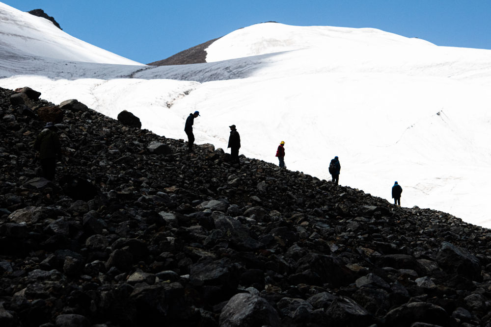 7月28日,科考隊計劃在崗加曲巴進行冰川觀測。但是到了現場,我們發現探測點附近的一條河流已發育得較大,導致隊伍無法通過,車輛能到達的點與冰川探測點太遠,這讓我提前做的拍攝方案全部泡湯。隨后,隊里臨時決定,更換位置,徒步攀登到旁邊3公里的格拉丹東雪山一處探測點。