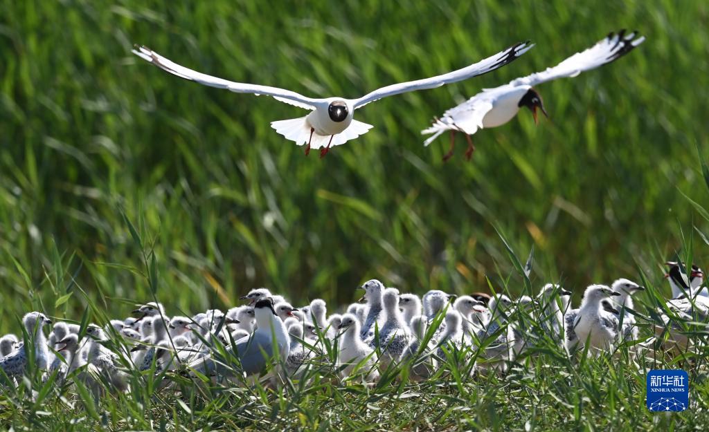 紅堿淖國家級自然保護區鳥島上飛翔的遺鷗(2022年6月22日攝)。神木市每年對紅堿淖湖心島遺鷗生存環境進行修復治理,實行24小時信息化監控等多項保護措施,來此繁殖的遺鷗種群數量逐年增加。
