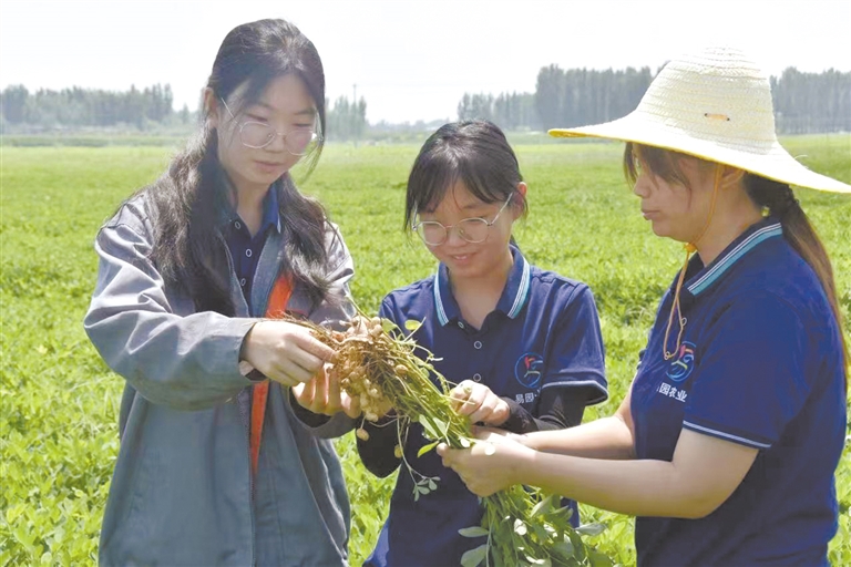 8月11日,參加暑期社會(huì)實(shí)踐的大學(xué)生在易縣花生生產(chǎn)實(shí)驗(yàn)田觀察花生生長(zhǎng)情況。