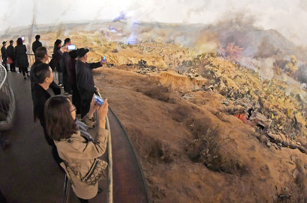 ↑觀眾在遼沈戰役紀念館全景畫館參觀(2018年4月11日攝)。