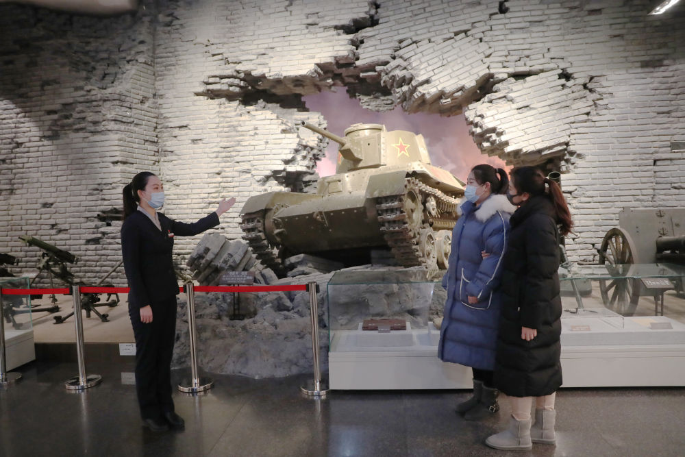 ↑遼沈戰役紀念館講解員為觀眾介紹人民解放軍攻城部隊攻破錦州城垣復原景象(2021年2月2日攝)。