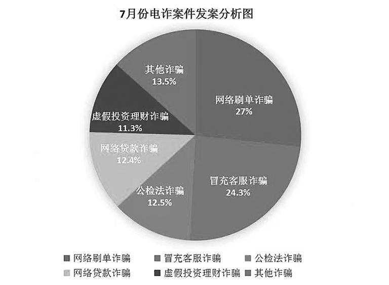 保定反詐中心經過數據分析,整理出了我市7月電詐案件主要集中在網絡刷單、冒充客服、冒充公檢法、網絡貸款及虛假投資理財這五大類高發詐騙類型,這五類詐騙占全市電詐總發案的86.5%,被騙人群中25-40歲的占比55%,41-59歲的占比25%。