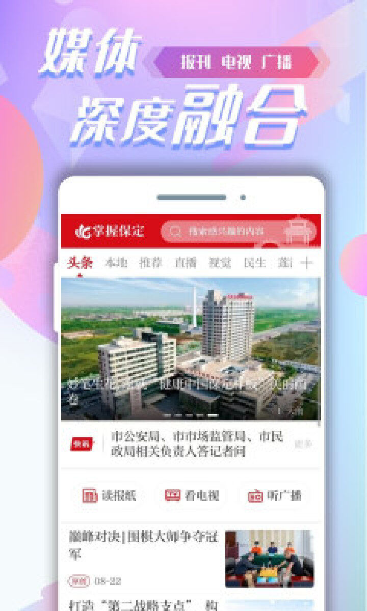 1 加入了“讀報(bào)紙 看電視 聽廣播”三個(gè)功能,讓用戶“一站式”閱讀《保定日報(bào)》、《保定晚報(bào)》,收看保定新聞?lì)l道、保定公共頻道、保定生活健康頻道,收聽保定交通廣播、保定經(jīng)濟(jì)廣播、保定新聞廣播、保定城市服務(wù)廣播。