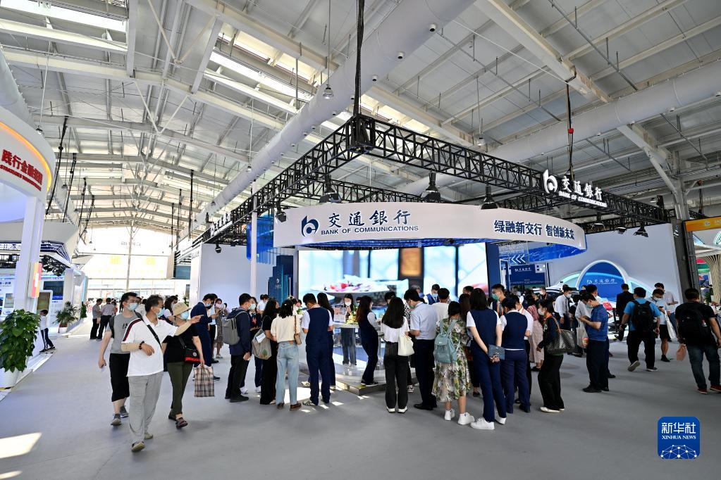 9月4日,在服貿會首鋼園區金融服務專題展交通銀行展臺,觀眾們咨詢和辦理業務。