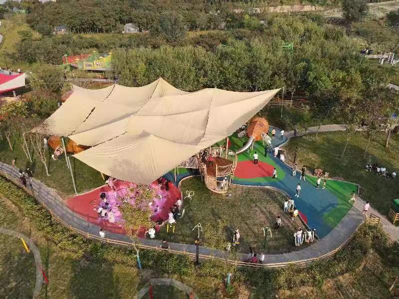 拾階往上走。盡管,當日刺眼的陽光照射,中秋時節的天氣尚熱,但樹影斑駁、和風習習,是那樣的舒適爽心。等到了叢林樂園,園里建起的多項新娛樂設施,除了滑梯平臺,其他游樂項目還叫不出名字。這里,順地勢,稍有一塊平地上,都建有一個透明的半球設施,這是供晚上露營的人們看天空的。的確別出心裁,在城里生活的人們,很難看到滿天星斗。晚上在這里,您可盡情欣賞燦爛銀河、繁星點點。