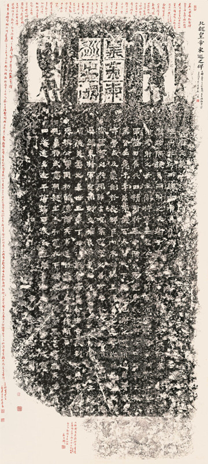 1936年,《御射碑》歷經千年后又被發現,即位于北管頭村北畫貓王子墳旁之第三碑。時任故宮博物院古物館館長徐森玉諸先生親臨碑址,雇工傳拓,始為學界所知。周肇祥、傅增湘、羅振玉、陳云瀛、壽鵬飛、孟桂良、施蟄存、傅振倫諸學人都做了初步研究,以其立碑年代之早,鑒為北魏第一碑。壽鵬飛總纂《易縣志稿》載曰:“碑文書法類大小二爨,碑漫漶過半,其可辨者尚二百四十余字,不能審其全碑,文字之確數大約十五行,行二十六字,碑高約七尺,寬四尺余,讀其文字與酈注所載義同而文不同,后系頌詞,末行年月亦蝕不可考。”逐行有錄文。