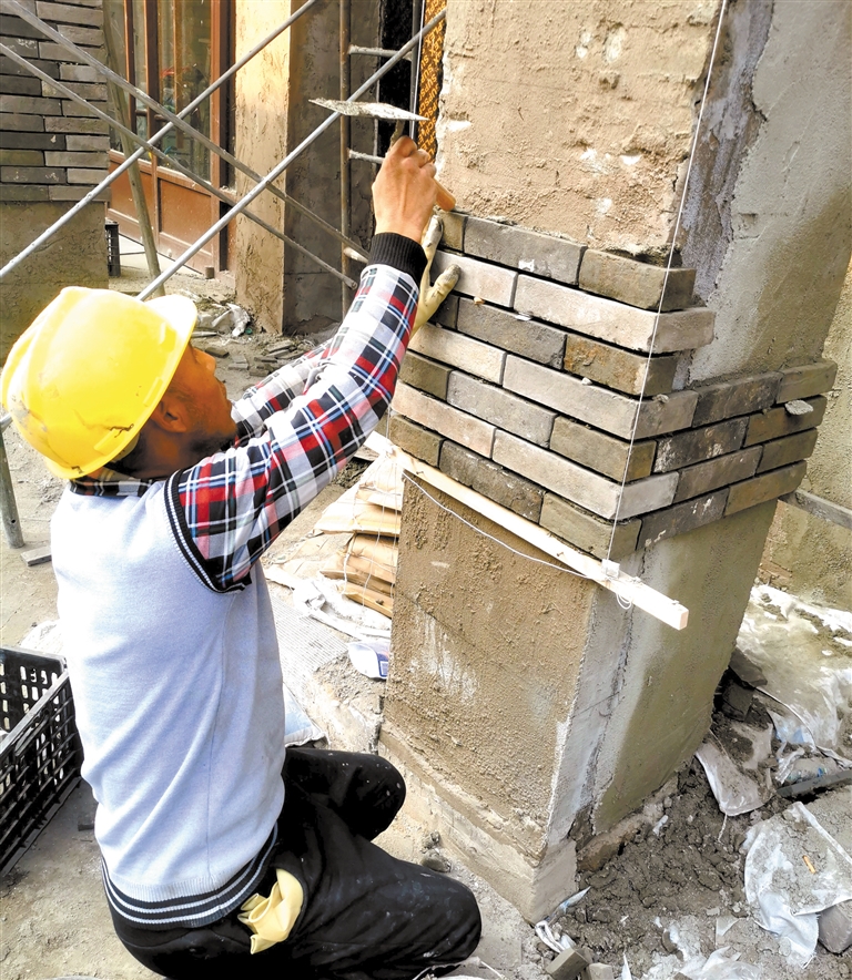 沒過多久,工人們帶著我們開始進行鋪貼實驗。經過半個月的鋪貼工藝改進、鋪貼效果比對后,鋪貼方案確定下來。改進后的方案對鋪貼操作要求很高,膠抹厚了,磚貼得不平整、垂線不直,都會影響整體效果。最終,經過層層選拔,50名鋪貼能手從200名鋪貼工人中脫穎而出,可以拿我們進行作業。