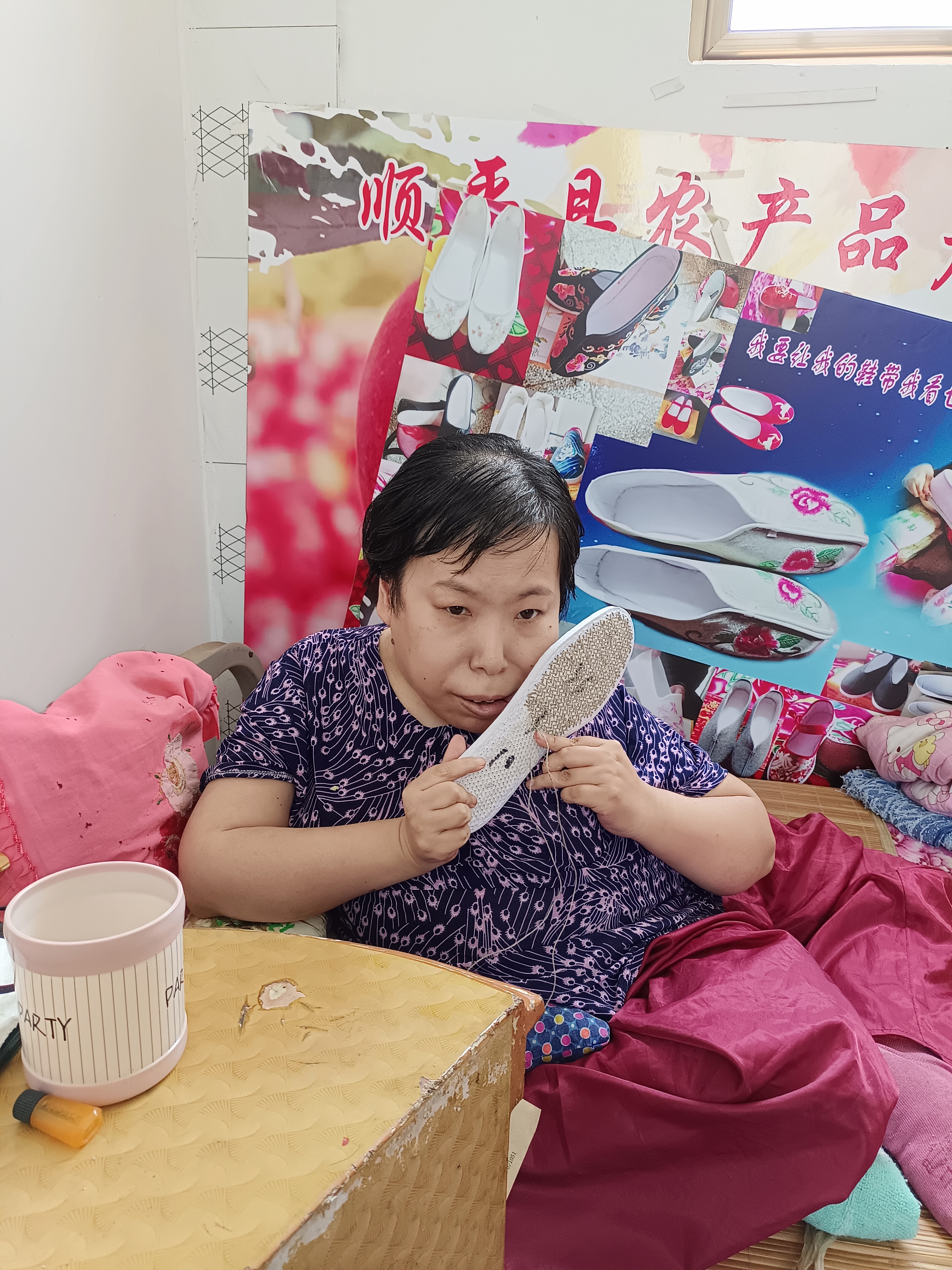 在順平縣蒲陽鎮霍家關村,一個普通的農家里,姬寧坐在床上,手里拿著麻線,一針一針地納著鞋底。一指厚的鞋底,需要用結實的粗鋼針,拔出連著麻線的鋼針可是一個力氣活兒。與其他人干活不同,姬寧不是用手而是用牙齒把針拔出來——因為長期臥病在床,姬寧的雙手出現不同程度的肌肉萎縮,使不上勁兒。即便如此,這個堅強的姑娘還是用牙齒完成了這項艱難的工作,納出來的鞋底針腳整齊勻稱、結實耐穿。