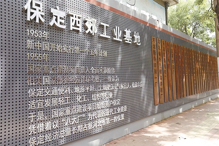 繼續往南,西郊“八大廠”的白色字樣出現在墻上,大字的左邊是藝術照片墻,右邊一塊塊鐵質的牌子也同時映入眼簾,牌子上鏤空刻著“化學工業部第一膠片廠”“保定化學纖維聯合廠”“保定變壓器廠”等“八大廠”名字,西郊“八大廠”的簡介更是保定市工業發展的縮影,這是古城人民一段特殊而美好的記憶。