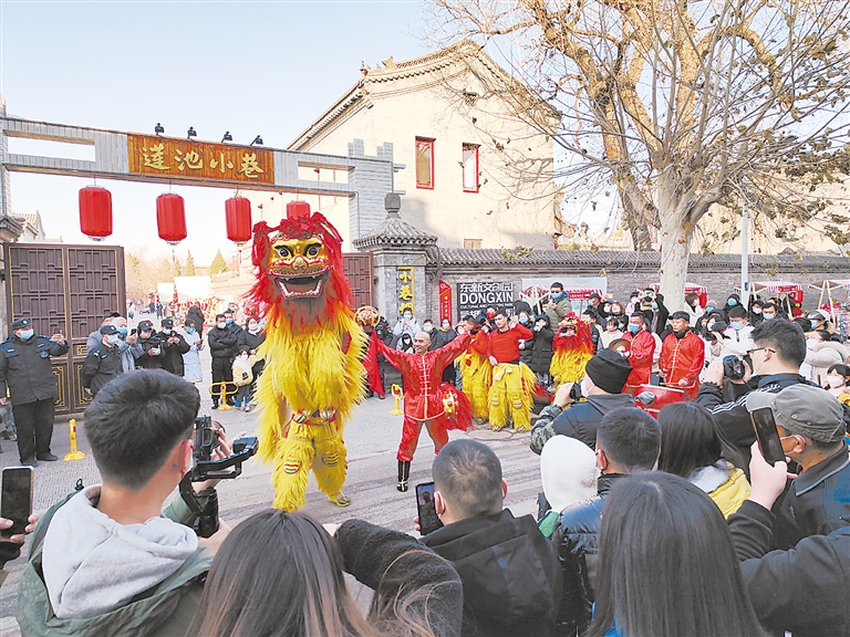2022年的最后一天,伴隨著叮叮咚咚的鑼鼓聲和龍獅的舞動,“年味蓮池”菊胡同首屆新年文創市集開市試運行。