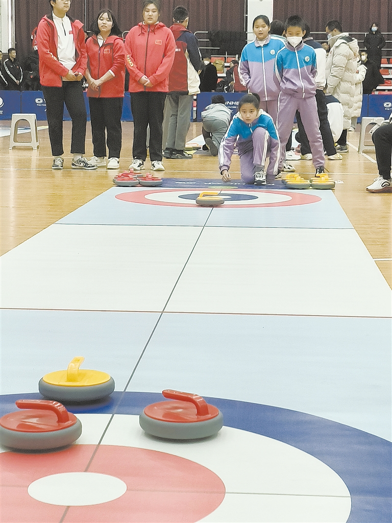 與此同時,陸地冰壺比賽在保定一中分校體育館開賽,共18個代表隊的270名選手參賽。激烈的比賽中,選手們?nèi)褙炞ⅲ瑘F結(jié)合作。