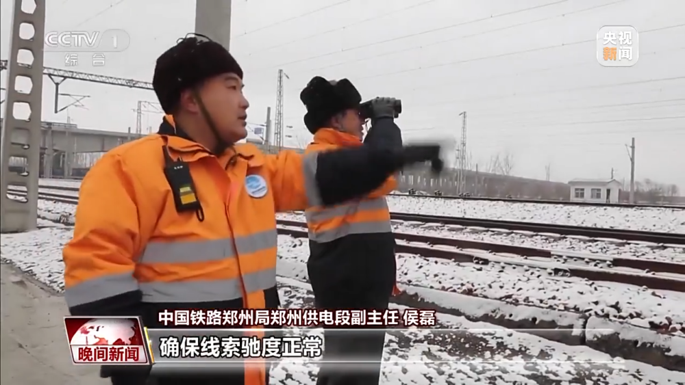 中國鐵路鄭州局鄭州供電段副主任 侯磊:氣溫驟降會對接觸網線索張力造成影響,我們加大重點設備的檢查力度,確保線索弛度適當,保證供電設備安全。