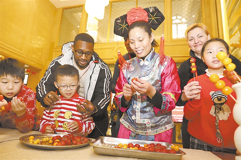 留學生西馬體驗保定非物質文化遺產滿族何記糖葫蘆制作技藝。