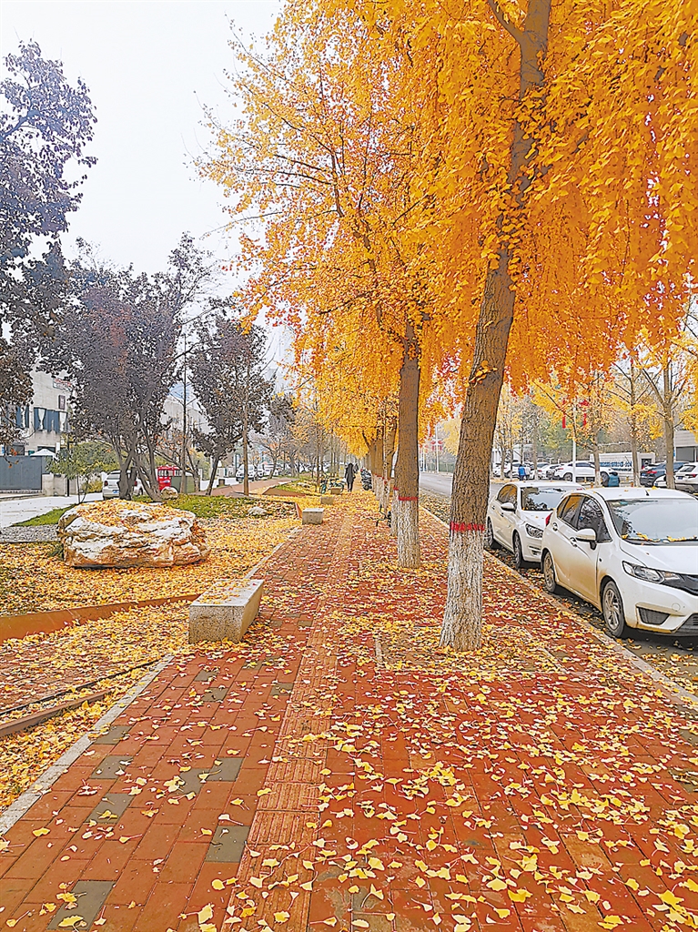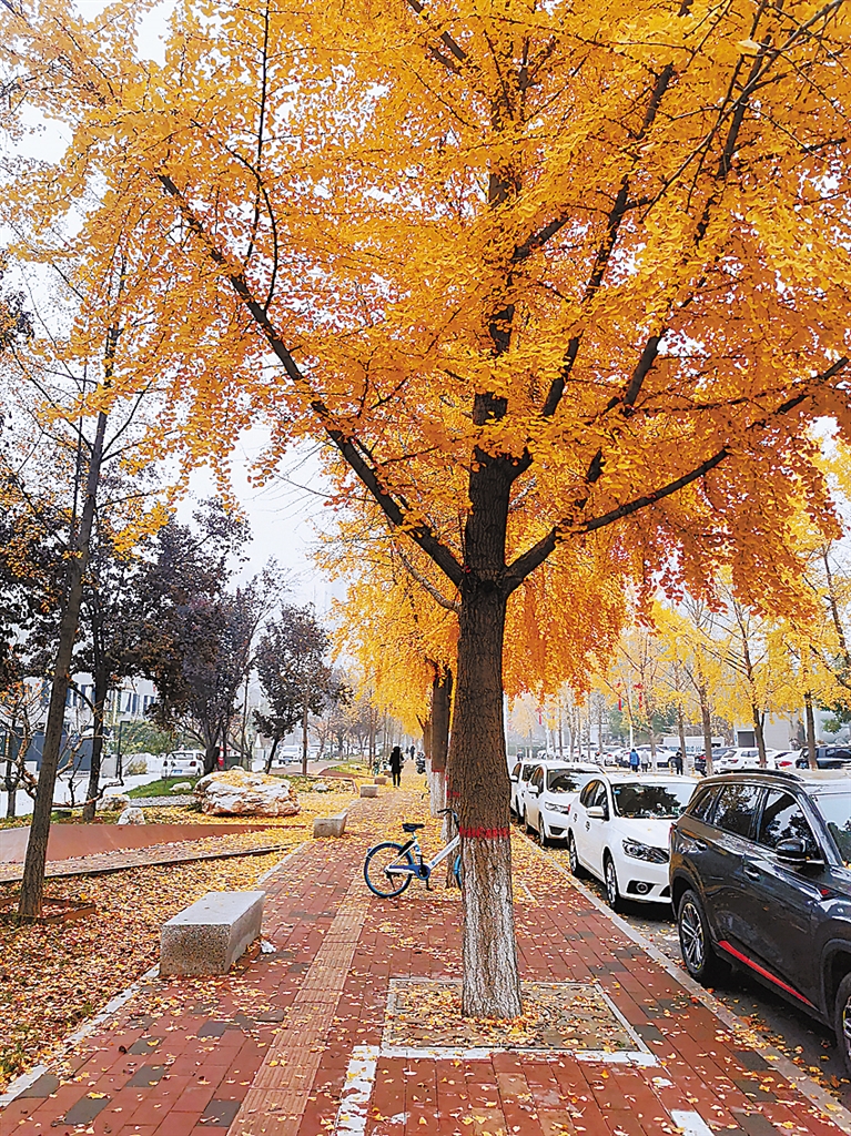 每逢秋日的周末,前往銀杏路打卡拍照的市民絡繹不絕。銀杏路全長4公里。兩側遍布銀杏樹。最美的一段當屬銀杏路與朝陽北大街交叉口往東一段。這段道路兩側建筑美觀,樹形漂亮,往來的行人車輛也不多。銀杏樹和路上落葉與周圍的藍天白云、高樓碧草相互映襯,行走其間,詩意十足。