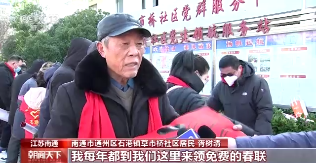 南通市通州區石港鎮草市橋社區居民胥樹清:我每年都到我們這兒來領免費的春聯。這個手寫的春聯更有年味,更有傳統。
