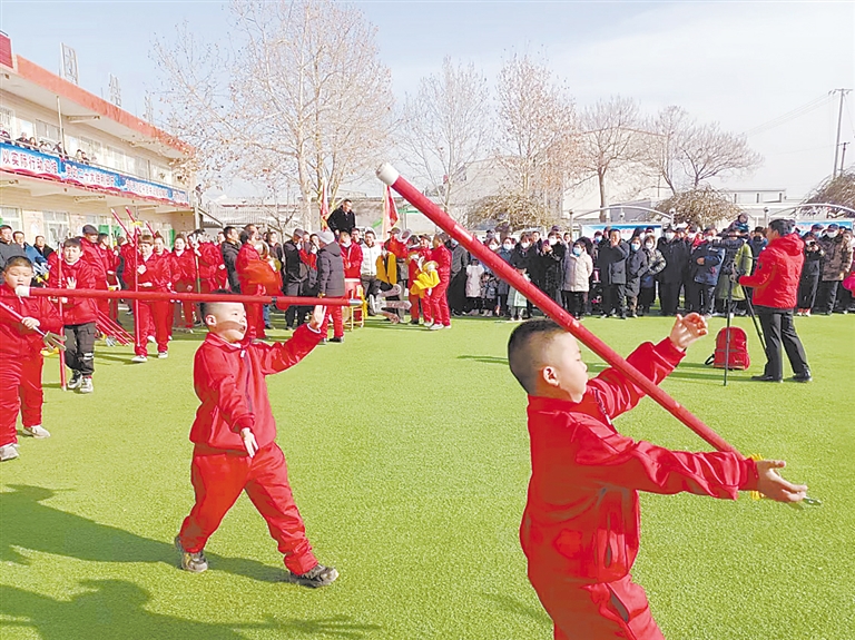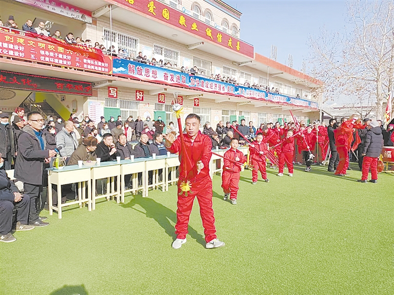 活動現場,演員們身著盛裝伴隨著鏗鏘的鑼鼓聲激情演繹,操場上鋼叉飛舞鼓聲陣陣,有身強體壯的青年、颯爽英姿的美女,有八十歲的老叟、在校玩童……各個都展示著他們的技藝。觀眾們看的是津津有味,叫好聲鼓掌聲此起彼伏,一場原汁原味的民間藝術大餐令在場的群眾沉浸在歡樂喜慶的氣氛中。