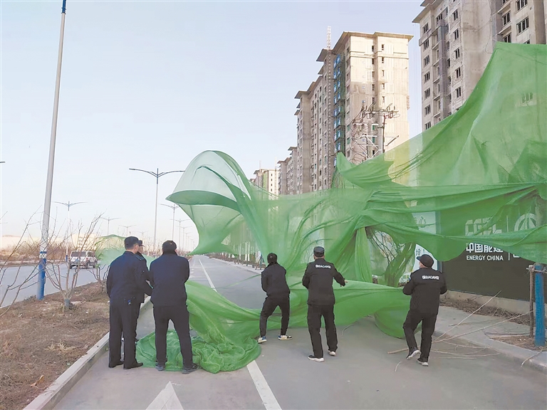 據了解,1月18日16時許,蓮池區執法局二大隊執法隊員巡查至荷華路時,發現樊莊安置區內覆蓋的大面積綠網被強風刮起,緊緊纏繞在附近路燈桿及施工現場的變壓器上。