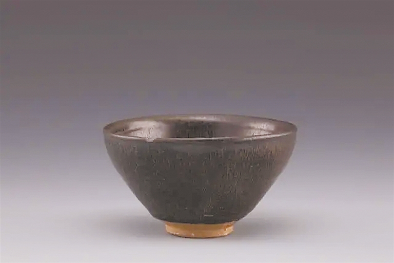 建盞是一種黑釉瓷盞,因產于宋代的福建路建州得名。中國茶葉博物館展陳學術部主任、研究館員樂素娜說,這枚建盞高6.9厘米、口徑12.5厘米、底徑4.4厘米,深弧腹,小圈足。之所以以“兔毫”為名,是因為燒制時茶盞內外的釉面里析出的鐵結晶看似絲絲兔毫。宋人根據“兔毫”色澤不同,又分為“金兔毫”“銀兔毫”“黃兔毫”,這件兔毫盞當屬“銀兔毫”。