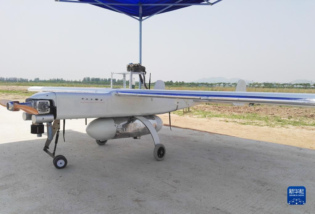 這是在安徽淮北一處試驗場準備試飛的無人機(2018年5月13日攝)。由中國航天科工二院23所自主研發的無人機機載下投探空系統順利完成試驗,填補了國內利用大型無人設備開展氣象探測的空白。新華社發(中國航天科工二院供圖)
