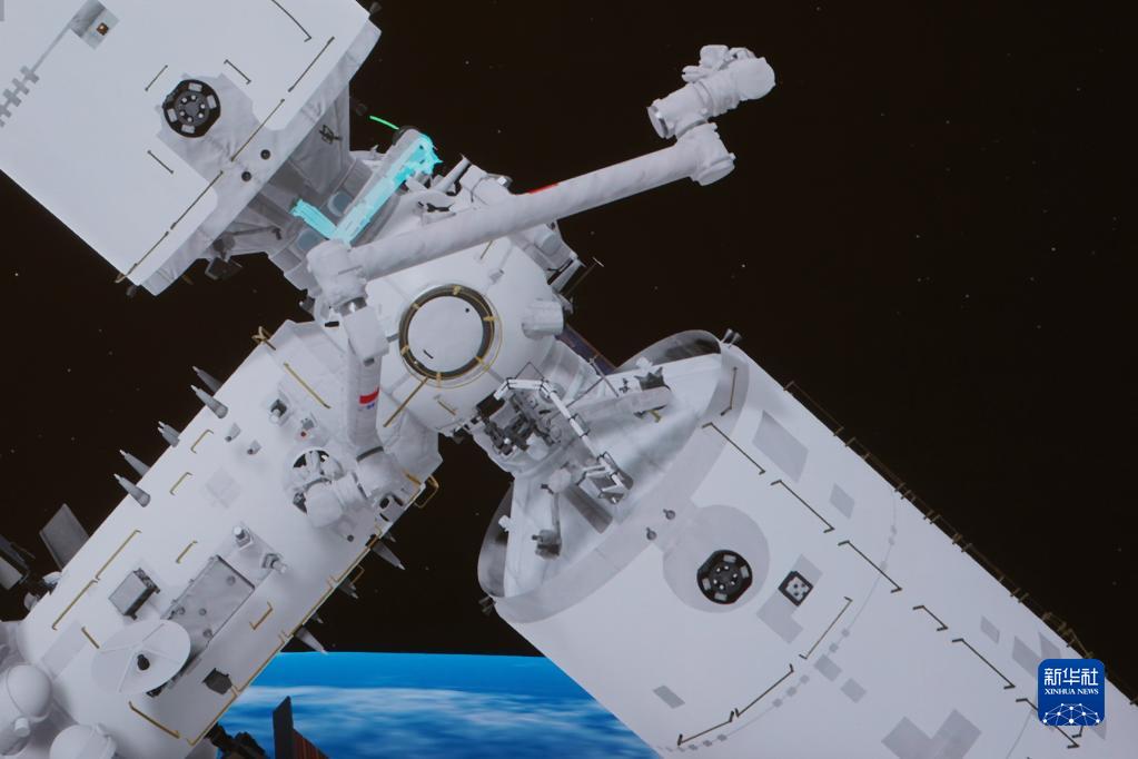 這是2022年11月3日在北京航天飛行控制中心拍攝的空間站夢天實驗艙完成轉位的模擬圖像。新華社發(孫豐曉 攝)
