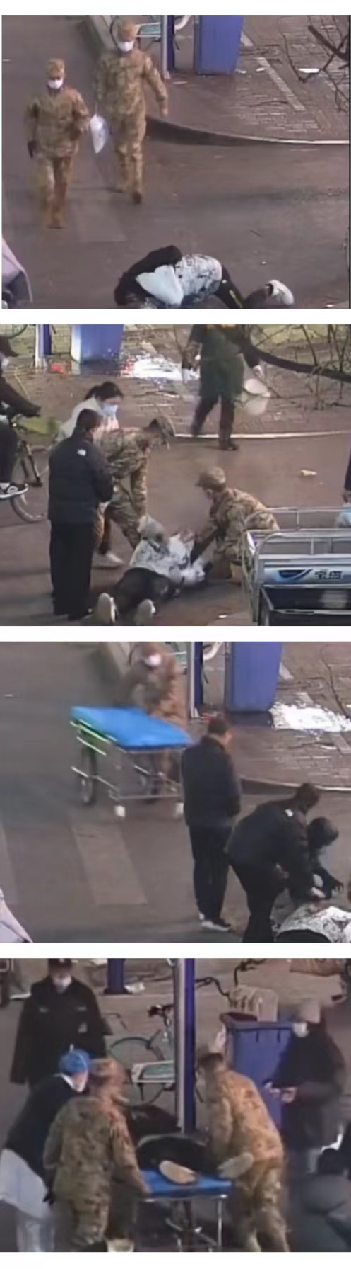 在這段時長約6分鐘的視頻中,記者看到,2月8日20時16分許,在百花路與恒祥大街交叉口往西100米附近,一名男子突然面朝下倒在路邊,身體不斷抽搐,四周陸續圍上不少群眾。危急時刻,兩名身穿軍裝的戰士立即上前救助。一名戰士蹲下身子,迅速給男子解開領口,協助他翻轉身體側臥,輕輕清理其口鼻堵塞物,然后讓他平躺在地上,頭部側放。與此同時,另一名戰士快速向距離最近的醫院跑去,不一會兒便推來轉運車,在眾人幫助下,將倒地男子抬上轉運車。此時,醫護人員和保安也趕到現場,順利將男子送往醫院救治。