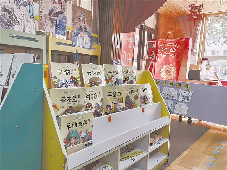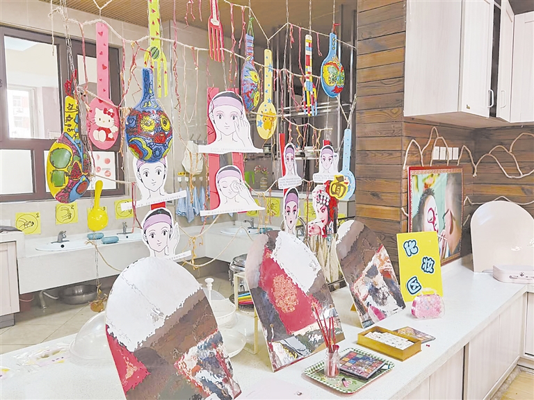 中二班教室裝飾得宛如一個戲曲舞臺,戲曲特色濃郁。教室南側有一個小小的戲臺——“梅花劇場”,戲臺左右兩側的門簾上繡有“出將”“入相”的字樣。不大的教室里隨處可見戲曲元素,分為服裝道具區、化妝區、戲曲科普區、我和戲的故事分享區等區域。服裝道具區展示著戲曲服裝、盔頭、舞鞋。化妝區則擺放著鏡子、化妝刷、彩粉盤,學生可以模仿古代戲曲演員銅鏡上妝。戲曲科普區里擺放著《豫劇》《昆曲》《黃梅戲》等劇目的分類讀本以及《花木蘭》《蘇武牧羊》《真假美猴王》等戲曲故事讀本。