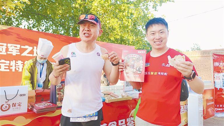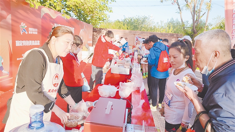 六點多的清晨,天空蔚藍如洗,陽光鋪滿賽道,動感音樂喚醒城市的蓬勃,激發著保馬運動員的澎湃激情。開放大學馬拉松存衣處對面,“游冠軍之城 品保定美食”2023保馬美食節美食品鑒區,清真午德齋、漕河驢肉、曲陽黑閨女餃子等十幾種保定特色小吃一字排開,誘人的香氣引來運動員們的駐足流連與開懷品鑒。
