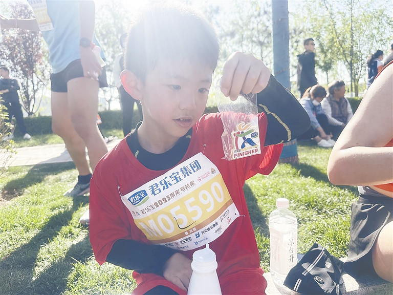 7歲的高御峰一邊大口喝著酸奶,一邊說:“我們報的是健康跑,我一直跟著跑‘半馬’的叔叔阿姨們跑來著。”他和另外兩名小跑者都來自天鵝小學,是一年級學生,在學校學習的是跳水項目,每天都有跑步訓練。所以,今天這健康跑的跑程,對于這幾個最大只有7歲的孩子來說,不是多難完賽的競跑。當記者問及為什么要學習跳水、練習跑步時,一旁的家長不假思索地回答:“讓孩子更快樂、更健康!”