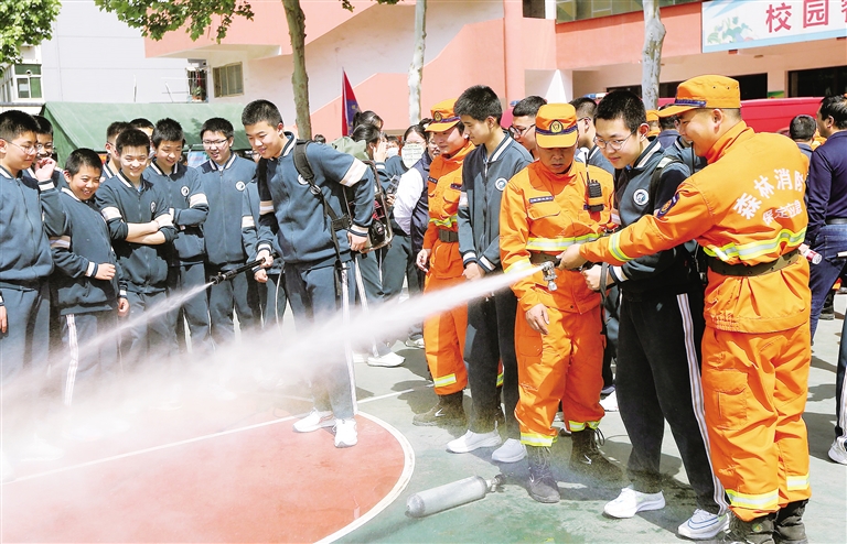 學(xué)生們親身體驗(yàn)滅火水槍的威力。
