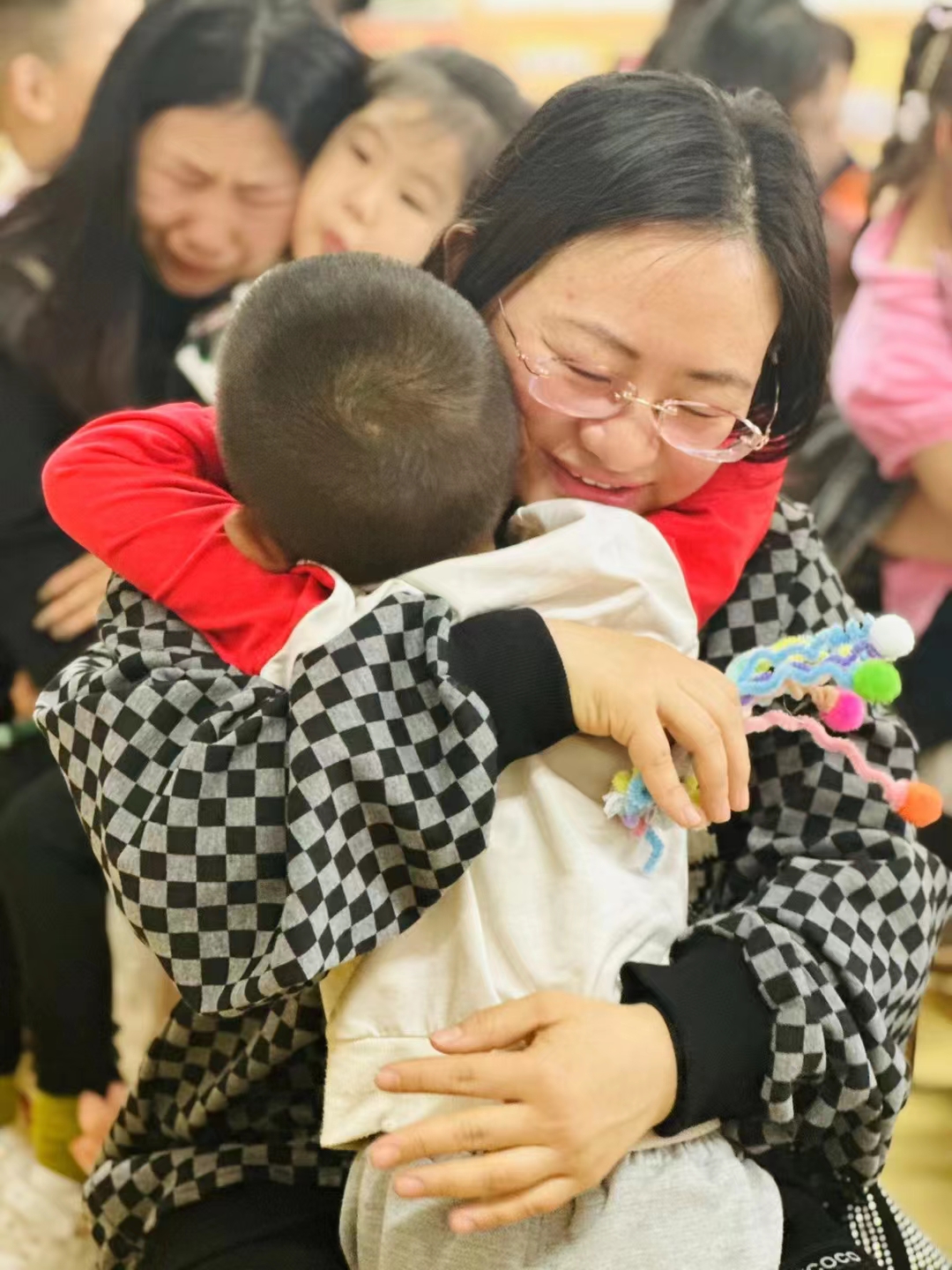 金玉蘭社區母親節活動中,一位年輕媽媽深情擁抱自己的孩子。 翟閃 攝