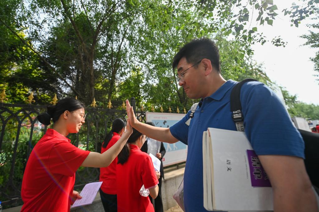 吉林省孤兒學校高專教育科主任趙春雨與考生擊掌祝福。新華社記者顏麟蘊攝